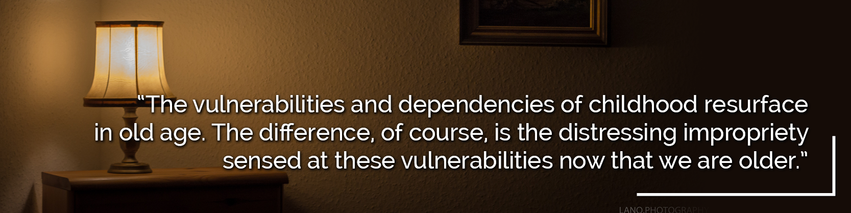 The vulnerabilities and dependencies of childhood resurface in old age. The difference, of course, is the distressing impropriety sensed at these vulnerabilities now that we are older. They rest awkwardly upon the shoulders of the aging. The cuteness of a toddler’s dependencies are now the despondencies of the aged. This is, to the older servant of Jesus, a strange country; a foreign land; an uncharted isle of frightening proportion.